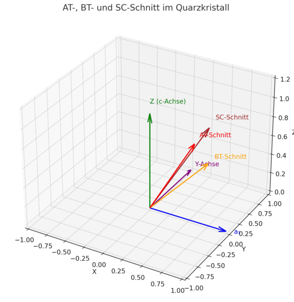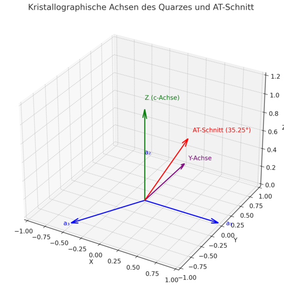 La sección AT es una sección inclinada (aprox. 35,25°) con respecto al eje Z en el plano X-Z. Se utiliza para producir cristales oscilantes de temperatura estable. La oscilación tiene lugar en el plano de la placa (modo planar).