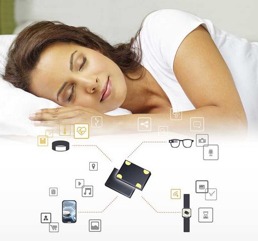 La mayoría de las soluciones Bluetooth de bajo consumo utilizan dos cristales de 32.768 kHz (uno para el modo de reposo del CI BLE y otro para el reloj de la MCU) y un cristal de MHz como frecuencia de referencia para el chip BLE (Fig. 3). En una aplicación wearable típica, un oscilador de silicio de 32.768 kHz puede sincronizar simultáneamente el modo de suspensión del BLE y la MCU. Esto ahorra muchísimo espacio en la placa de circuito, ya que el ULPPO de 1,5 x 0,8 mm es sólo la mitad del tamaño del cristal de 32.768 kHz más pequeño de 1,6 x 1,2 mm y un 85% más pequeño que un oscilador de cristal de baja potencia de 3,2 x 2,5 mm.